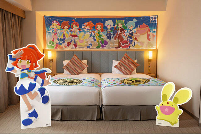 1日1室限定の「ぷよぷよ」コラボルームが登場。客室へ一歩入ると、人気キャラクターのアルルとカーバンクルがお出迎え。他にも35周年を祝うキャラクターたちが勢揃いしたタペストリーや歴代の「ぷよぷよ」がデザインされたフットスローが、皆さまを「ぷよぷよ」の世界へ誘います。ここでしか手に入らない、ご宿泊者限定のオリジナルノベルティもご用意。「ぷよぷよ」の世界観に浸る特別なひとときをお過ごしください。