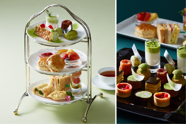抹茶やピスタチオを使用したスイーツを中心に、見た目と味わいともに爽やかな品々が並ぶアフタヌーンティーは、まるで新緑の風景をそのまま閉じ込めたかのような逸品。