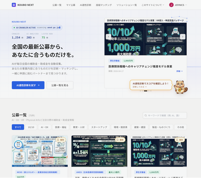 「KOUBO NEXT」は、AIによる公募要件診断および最適な企業間のコンソーシアム(座組)を自動マッチングする次世代プラットフォームです。(開発・運営:JOYNICS LLC)
