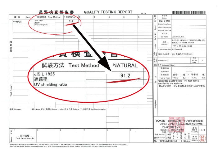 UV遮蔽率検査:91%以上(一般財団法人ボーケン品質評価機構)
