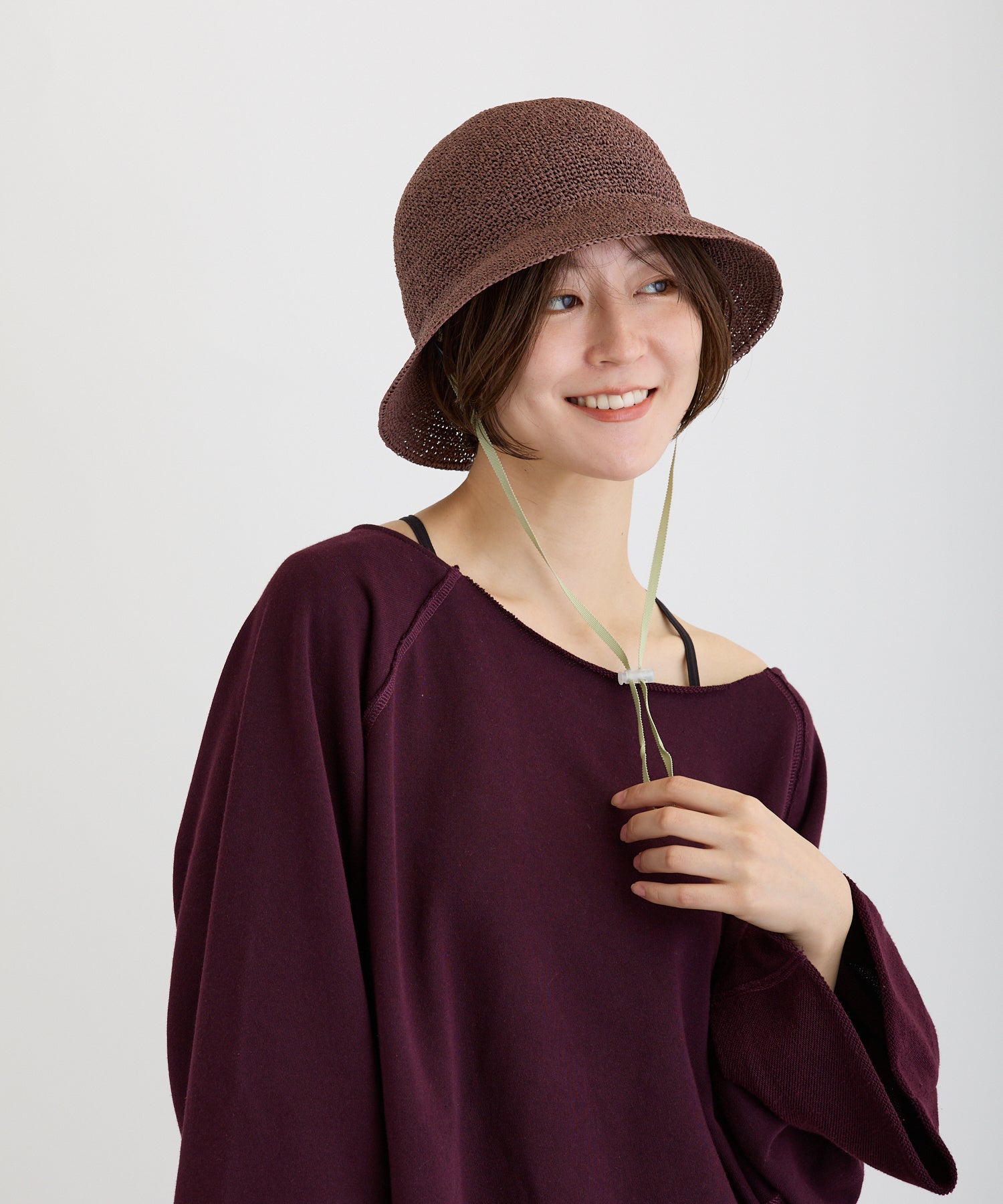 OJO+洗える手編み小つばハットあご紐付き:ココアブラウン