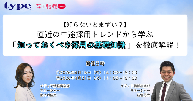 転職サイト「女の転職type」では、「直近の中途採用トレンドから学ぶ「知っておくべき採用の基礎知識」を徹底解説!」を公開いたしました。