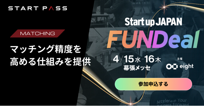 株式会社StartPass(本社:東京都新宿区/代表取締役CEO:小原聖誉)は、Sansan株式会社(本社:東京都渋谷区/代表取締役社長:寺田親弘)が提供する名刺アプリ「Eight」のスタートアップ×事業会社マッチングカンファレンス「Startup JAPAN FUNDeal 2026」(開催日:2026年4月15日~16日、会場:幕張メッセ 国際会議場)において、スタートアップと事業会社のマッチング精度を高める仕組みを提供します。