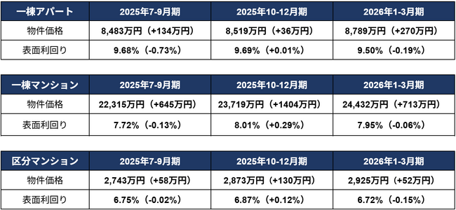 ※表面利回り・物件価格は期間中の平均 ※()内は前期比