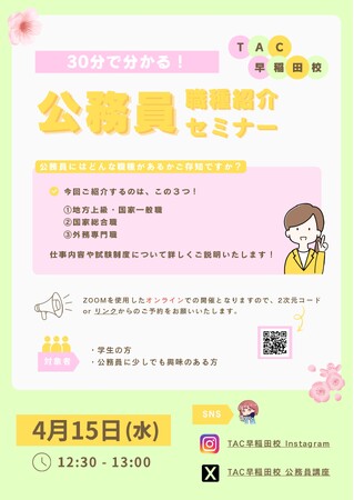 【TAC公務員】4/15(水)オンラインで開催!「30分で分かる!公務員の職種紹介セミナー」