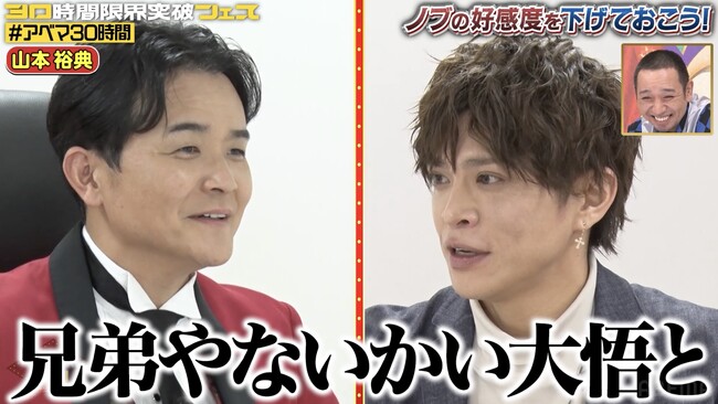 その後、話題は「ABEMA」オリジナルバラエティ『愛のハイエナ』シリーズでホストに挑戦している山本の“接客術”へ。客と一気に距離を縮める山本の“ゼロ距離接客”をノブが女性客役となって体験し、大悟が笑い転げる一幕もありました。さらにノブは、「名言とかいるやろ」と後輩ホストや客と揉めた時の必殺ワードとして、自身の大阪時代のツッコミである「寝てねえんじゃ!」を山本に伝授。大悟が「とんでもない武器与えてしまったな」と大爆笑する名シーンが誕生しました。爆笑必至の“好感度落下チャレンジ”は、ぜひ配信でご覧ください。
