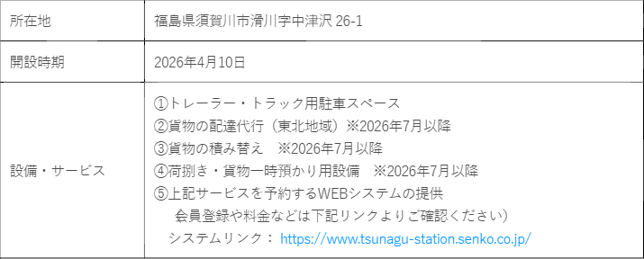 センコー株式会社(本社:大阪市北区、社長:大越 昇、以下「センコー」)と福山通運株式会社(本社:広島県福山市、社長:熊野 弘幸、以下「福山通運」)は、2026年4月10日、福島県須賀川市に中継輸送施設「TSUNAGU STATION 福島」を開所いたしました。