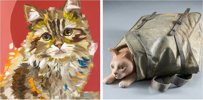 左)ぽじこ「金霞(kinka)」アクリル絵具・キャンバス (53×45.5cm) 55,000円(税込) 右)島田紘一呂「リュックの中の猫」 (H17×W56×D37cm 660,000円(税込)