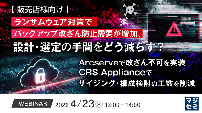 マジセミ株式会社は「【販売店様向け】ランサムウェア対策でバックアップ改ざん防止需要が増加。設計・選定の手間をどう減らす?」というテーマのウェビナーを開催します。