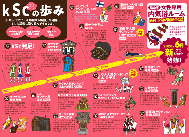 キスケ株式会社が運営するサウナブランドプロジェクト「kSc(Kisuke Sauna Club)」は、「日本一サウナーを応援する施設」を目指し、これまで情報発信、快適なサウナ環境の整備、地域への貢献という3つの活動を軸に歩みを重ねてまいりました。