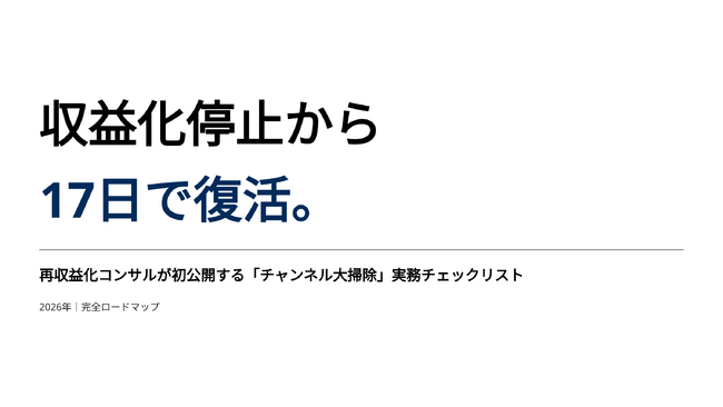 株式会社日本動画センター(本社:福岡県福岡市、代表取締役:山口直也)は、2026年基準のYouTube収益化審査に対応した「チャンネル大掃除」の実務手順をまとめた資料『収益化停止から17日で復活。再収益化コンサルが初公開する「チャンネル大掃除」実務チェックリスト』を無料公開しました。