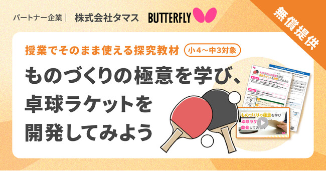 今回は卓球の「バタフライ」ブランドを展開する株式会社タマスと連携した探究学習プログラム「ものづくりの極意を学び、卓球ラケットを開発してみよう」を提供いたします。なお、本プログラムは小・中学校向け探究学習ライブラリー「SPARKE(スパーク)」よりご利用いただけます。