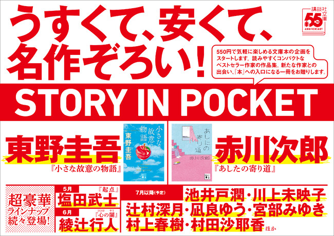 東野圭吾、赤川次郎など超豪華ラインナップで続々刊行。 この面白さで550円!講談社文庫から「STORY IN POCKET」企画がスタートします!