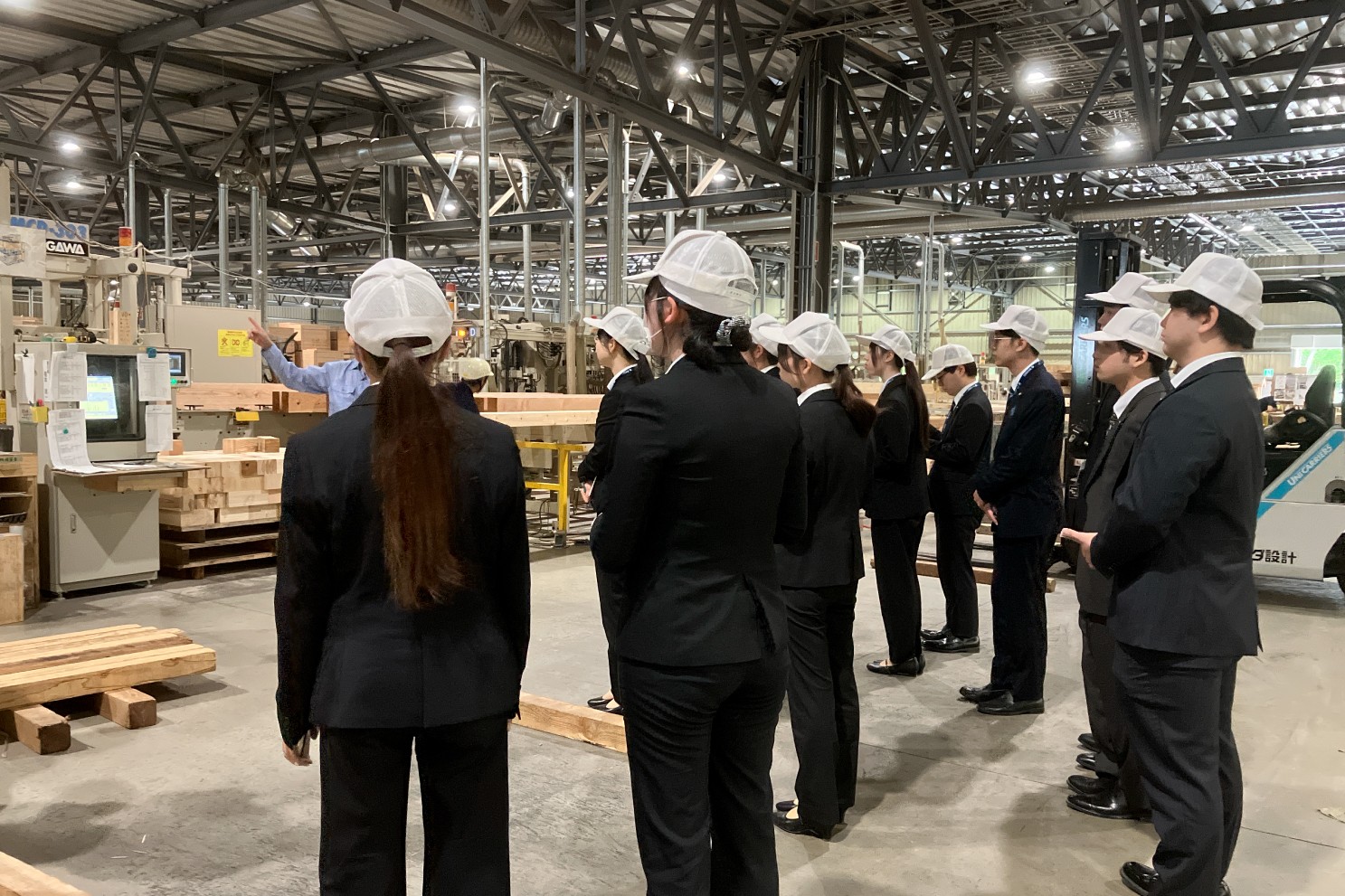 当日は、植樹に加えてプレカット工場の見学も行いました。プレカット工場は、木材の仕入れから加工、出荷までを担う施設であり、住宅品質の根幹を支える重要な役割を担う施設です。また、非住宅木造建築のショールームとしての機能も備えており、木造建築の可能性や当社のものづくりへのこだわりを体感できる場となっています。新入社員は、実際の加工工程を間近で見学することで、住まいづくりの基盤となる工程への理解を深めました。