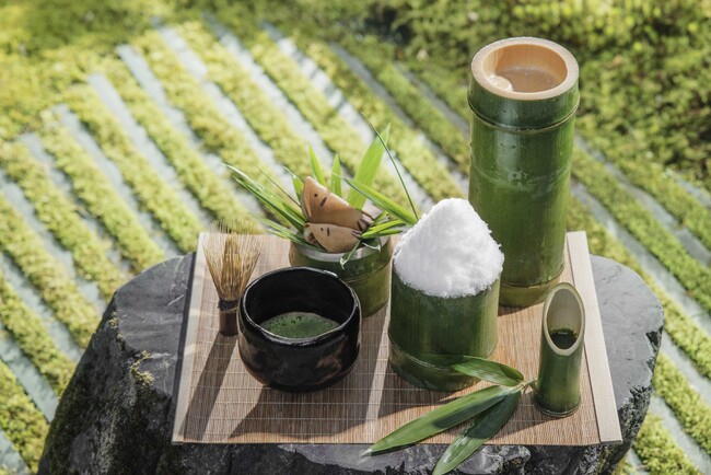 鮮やかな青もみじを眺めながら、星のや京都特製のかき氷を楽しみます。シロップには、爽やかな蓼(たで)と和三盆を合わせました。器は、嵐山の青々とした夏の情景を表現した竹の器です。かつて平安貴族は、当時貴重だった氷を削り、高貴な甘味料をかけて夏を涼んでいました(*3)。その雅な文化を現代に昇華させ、特製シロップには現代の高級甘味である和三盆を贅沢に使用しています。かき氷とともに味わうのは、平安時代に夏バテ予防の薬として重宝された大蒜(にんにく)の餡を忍ばせた(*4)、若鮎です。先人の知恵が詰まった甘味とともに、奥嵐山の涼を堪能できる贅沢なひとときです 。
