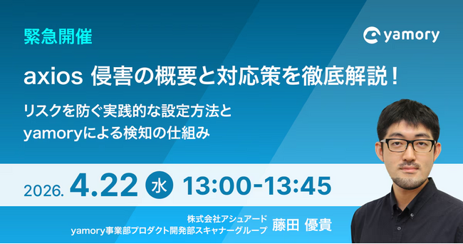 株式会社アシュアード(本社:東京都渋谷区、代表取締役社長:大森 厚志)が運営する、脆弱性管理クラウド「yamory(ヤモリー)」(https://yamory.io/ 以下「yamory」)は、2026年4月22日(水)に「axios 侵害の概要と対応策を徹底解説」ウェビナーを開催することをお知らせいたします。