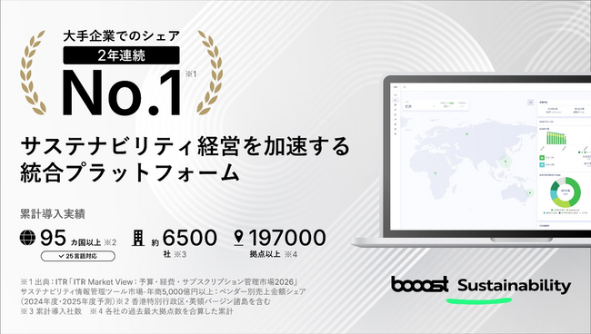 参考:プレスリリースbooost Sustainability、「SSBJ」で導入加速 累計導入実績が95カ国・約6,500社・197,000拠点以上を突破「企業価値向上」を支えるシェアNo.1プラットフォームに
