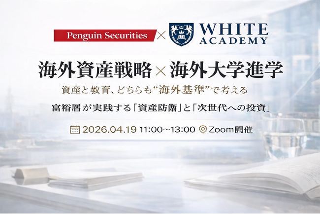 国内外の名門大学入試や一流企業就職を支援するホワイトアカデミー(Avalon Consulting株式会社、東京都新宿区、代表:竹内健登)は、シンガポールの証券会社、Penguin Securities Pte. Ltd.の日本支社セールスマネージャーである金子雄人氏を講師に迎え、経営者・富裕層家庭を対象とした特別オンラインセミナーを2026年4月19日(日)に開催いたします。