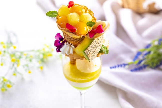 「メロンクレープのブーケパフェ」は、初夏にぴったりの爽やかな味わいでメロンを贅沢に愉しめる季節限定のパフェです。