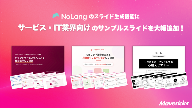 株式会社Mavericksは、動画生成AI「NoLang」のスライド生成機能にサービス業・IT企業向けサンプルスライドを追加。商談・セミナー・採用・研修の資料作成を効率化