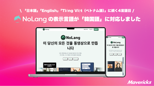 株式会社Mavericksは、動画生成AI「NoLang」のUIを新たに「韓国語」に対応。日・英・越に続く4言語目として、操作画面から動画生成までを韓国語のまま完結できる制作環境を実現