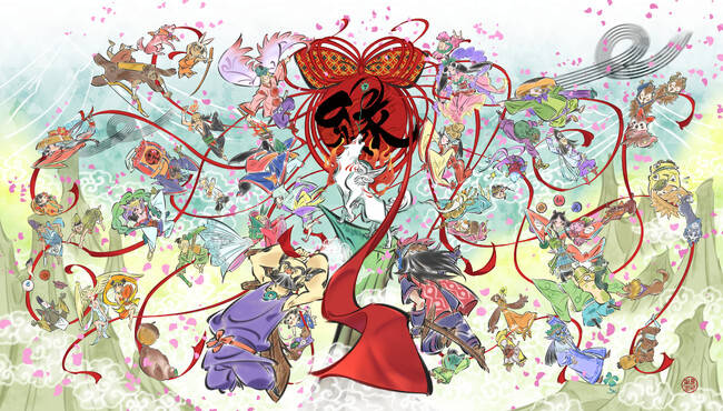 サイトを飾る20周年記念アートは『大神』でキャラクターデザイナーの1人として参加されたデザイナー 島崎麻里氏の描き下ろし。赤いリボンは『大神』のキャラクターたちと皆さまとの“縁”が表現されており、アマテラスを中心に『大神』の個性的なキャラクターたちが所狭しと並ぶアートとなっています。イラスト内にある”縁”の筆文字は『大神』のロゴをデザインされた書道家 成田眞澄氏に揮毫頂きました。