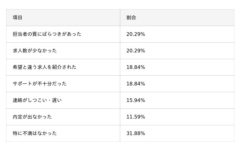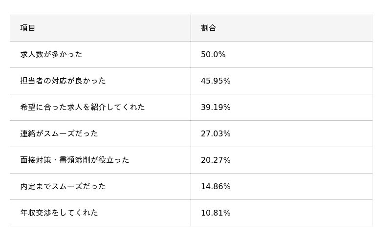 - 満足度は「満足以上」が58.0%と過半数を占め、主な理由は「求人数の多さ」(50.0%)や「担当者の対応の良さ」(46.0%)。一方で、「担当者の質のばらつき」(20.3%)などの不満も一定数存在し、評価の分かれ目となっている。