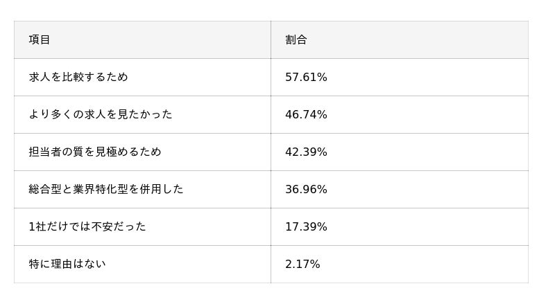 - 利用社数は「2社以上の併用」が56.1%と過半数にのぼり、理由としては「求人を比較するため」(57.6%)が最多。より多くの求人確認や担当者の見極めなど、複数サービスを使い分ける動きが主流となっている。