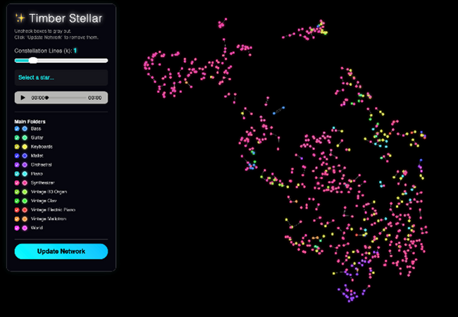 これにより、従来のように個別に試聴しながら音を探すのではなく、関係性を俯瞰しながら目的の音や類似した音へと効率的にたどり着くことが可能になります。さらに、カテゴリ情報を保持しながらも、それに縛られない横断的な探索を可能にしており、ジャンルを越えた新たな音の組み合わせや発見を促します。
