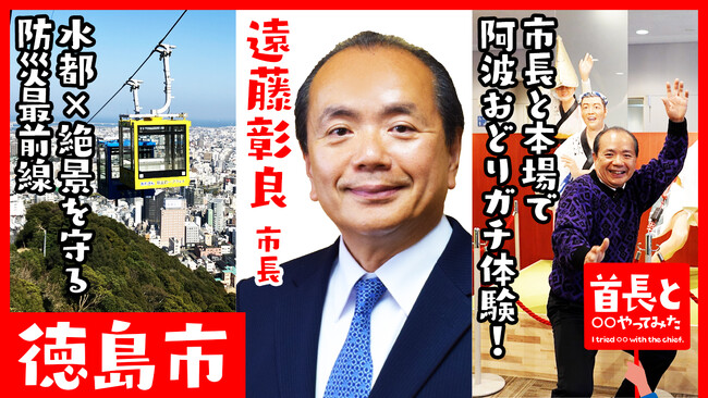 4月20日に配信開始しました、『首長と○○やってみた』では、徳島県・徳島市の市長、遠藤彰良氏が登場し、ポストの上にミニ阿波おどり銅像が立つ徳島駅前から徳島市の魅力をアピールします。徳島県徳島市は、徳島県の県庁所在地で、吉野川をはじめ多くの河川が流れる“水都”として知られています。400年以上の歴史を持つ伝統芸能「阿波おどり」が毎年8月に開催され、国内外から多くの観光客が訪れます。また、眉山や新町川周辺の景観資源を活かした回遊性向上を目的とした中心市街地活性化施策を推進しています。近年はデジタル技術の活用や防災体制の強化にも取り組み、魅力あるまちづくりが進められています。