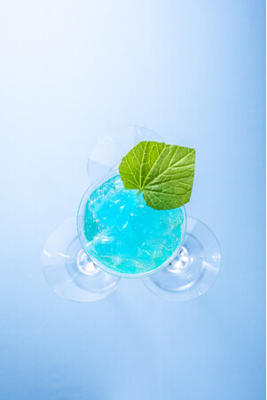 『てまりくさ』は、鮮やかなブルーが印象的なカクテルで、甘く、トロピカルな味わいが特徴です。その魅力をそのまま閉じ込めるように、今回はゼリー仕立てにアレンジしました。グラスに盛り付けたゼリー状のフルーツリキュールに、仕上げのスパークリングワインを注ぐことで、ぷるんとした食感と、きめ細やかな泡を調和させました。口に運ぶと、ゼリーのやさしい甘みとフルーティーな香りが広がり、続いてスパークリングワインの爽やかな酸味と清涼感が後味を引き締めます。