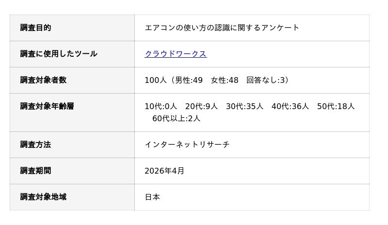 おうちにプロでは、エアコンクリーニングでお悩みの方により有益な情報を提供するために、「エアコンの使い方の認識に関する独自調査」を実施しました。アンケート調査の概要は以下の通りです。