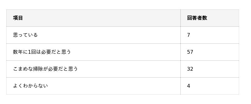 - お掃除機能付きエアコンは内部掃除がずっと不要だと思っている人は7%とかなり少なく、数年周期での清掃が必要だと思う人は57%いる。