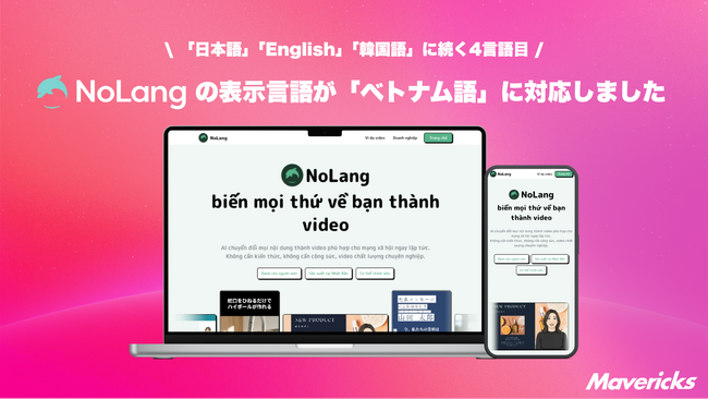 株式会社Mavericksは、動画生成AI「NoLang」のUIを新たに「ベトナム語」に対応。日・英・韓に続く4言語目として、操作画面から動画生成までをベトナム語のまま完結できる制作環境を実現