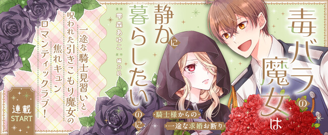 『毒バラの魔女は静かに暮らしたいのに ~騎士様からの一途な求婚お断り~』(漫画:雫森あゆこ 原作:編乃肌)の連載がスタートします!