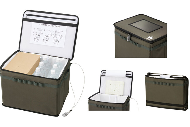 さらに、盗難対策用のダイヤル錠と固定用のワイヤー付きで、防犯面にも配慮しているので、置き配時の心配を軽減するほか、フタ部分や側面には撥水加工を施した生地と、底面には耐水性・耐久性に優れたターポリン生地を採用することで、晴雨関係なく屋外設置に対応します。また、使用しないときはコンパクトに折り畳めるので、保管場所を取らず、収納も簡単です。