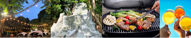 2026年は、アメリカンBBQの生みの親であり、蓋付きグリルのパイオニアともいえる「Weber」社のグリルと、最大6人までお楽しみいただけるタープテント設営エリアを導入。本格的なグリルを初めてご利用のお客様にも、より美味しくお召し上がりいただけるようスタッフが丁寧にご説明しサポートをいたします。また、今回導入するWeberグリルは、蓋を閉めることで高火力で焼き上げ、「クリスピー」な食感+「香り」も閉じ込め、スモーキーなフレーバーを食材へ移すという特長を持っており、BBQ初心者の方でも美味しく焼き上げることが可能です。緑豊かで開放的なロケーションの中で1組ごとにタープテントをご用意し、お客様に非日常空間をお届けいたします。