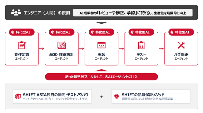 SHIFT ASIAがソフトウェア開発やテスト業務で積み重ねてきた実践的なノウハウと、SHIFTグループの強みである独自の品質保証メソッドを、AIのスキルとして組み込んでいます。これにより、一般的な生成AIにありがちな品質のブレを防ぎ、高品質な要件定義・設計・実装・テストを実現します。
