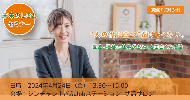 イベント名:未来のしごとセミナー「“人の役に立つ”だけじゃない。医療・福祉の仕事がちょっと面白くなる話」日時:2026年4月24日(金)13:30~15:00(13:00開場)
