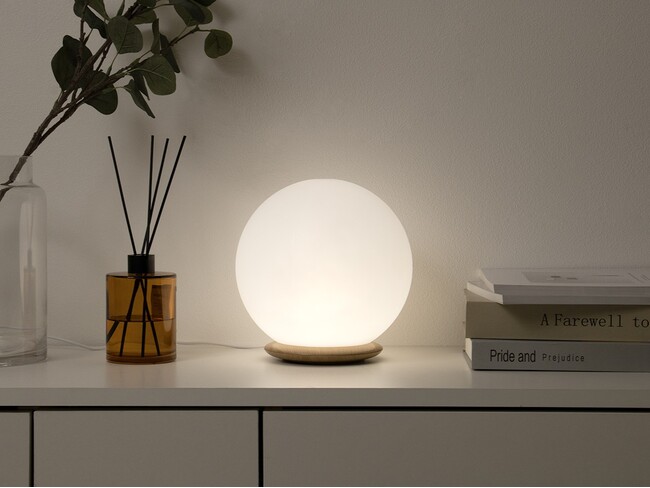 ⽩い球体と木目調の台座を組み合わせたデザインは、余計な主張をせず、リビングでも寝室でも空間にすっとなじみます。