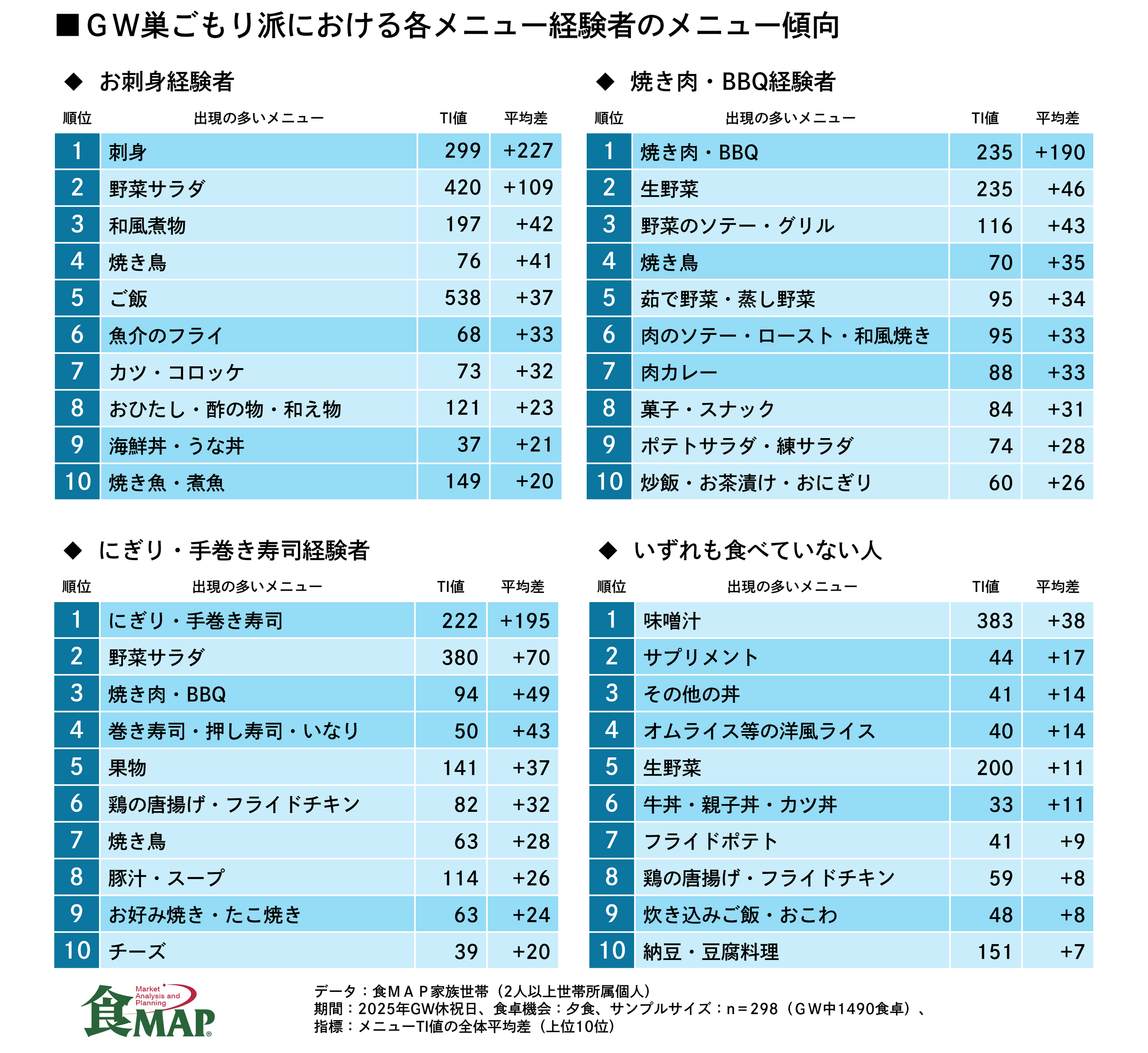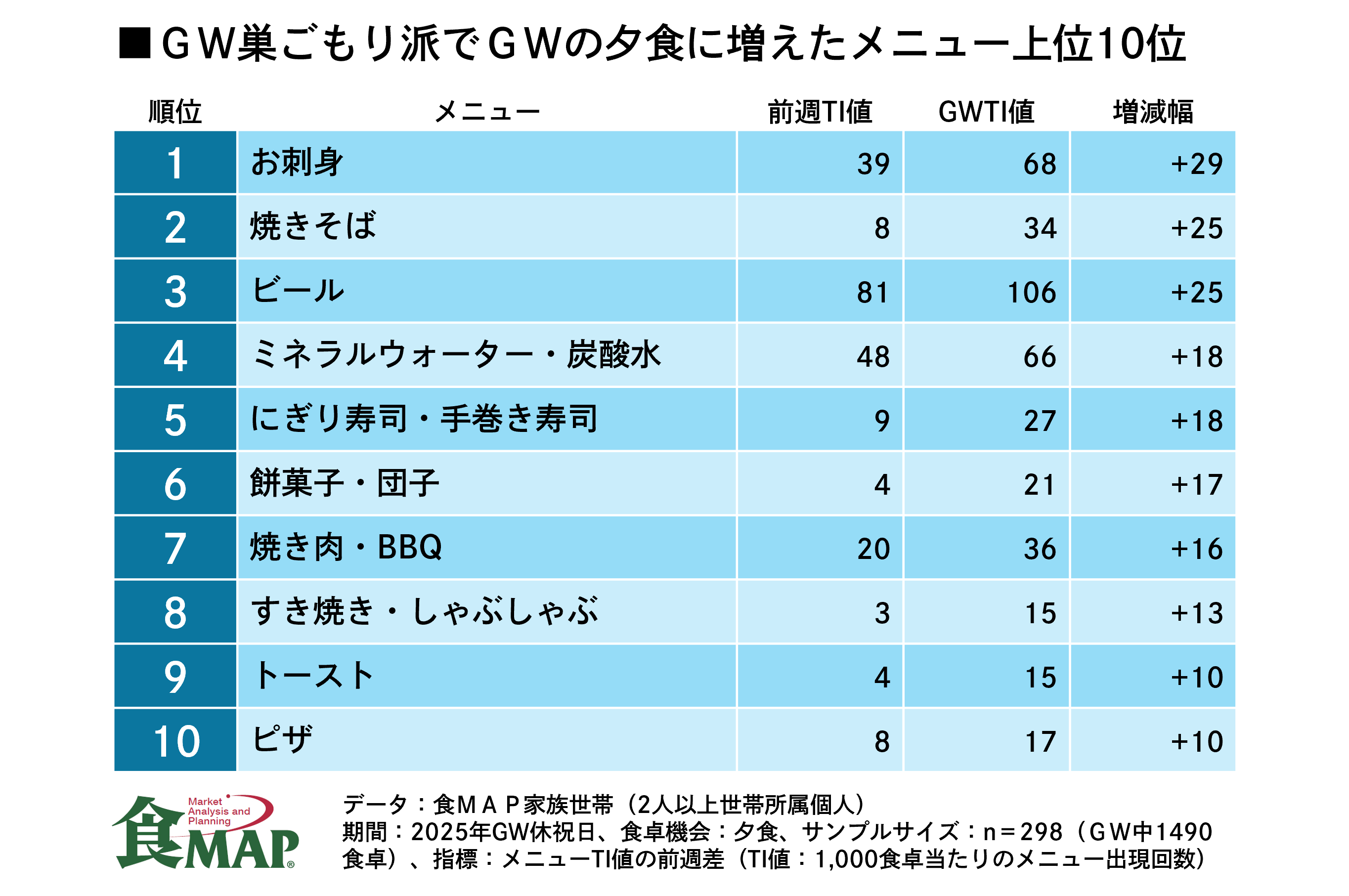 図表2は、2025年GWの休み中、毎日家で晩ごはんを食べていた人(以降、GW巣ごもり派)を対象に、前週よりも出現が増えた夕食メニュー(上位10位)を表しています。GWらしく、お刺身やお寿司、焼き肉などのハレメニューが増加しているほか、焼きそばやピザなども増えています。