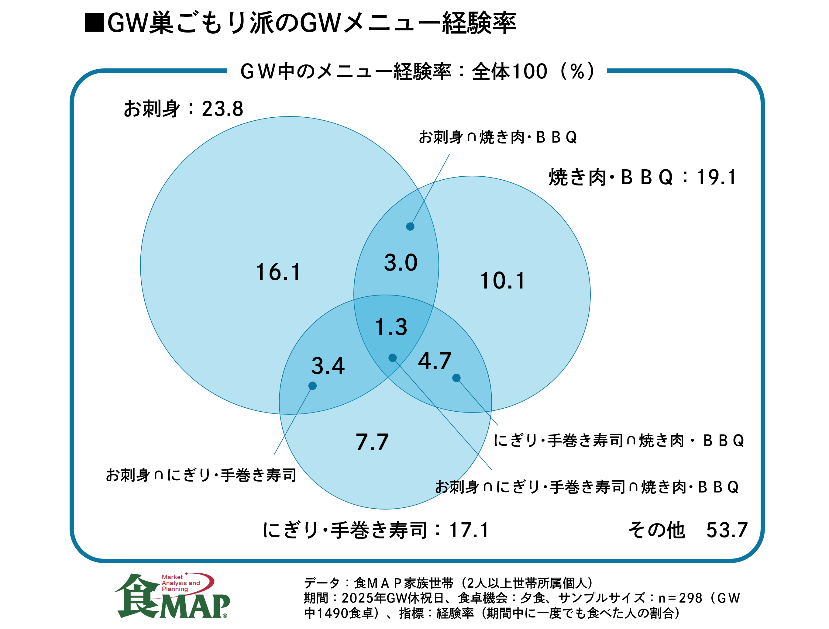 図表3はGW巣ごもり派におけるメニューの経験率を示しています。お刺身を一度でも食べた人は全体の23.8%と多く、同様に焼き肉・BBQは19.1%、にぎり寿司・手巻き寿司は17.1%となりました。3メニューいずれかを経験しているのは全体の46.3%と約半数、2メニュー利用は11.1%、3メニュー全てとなると1.3%と少数でした。お刺身や焼き肉、お寿司などいずれもGWの定番メニューではありますが、ユーザーは分かれているようです。