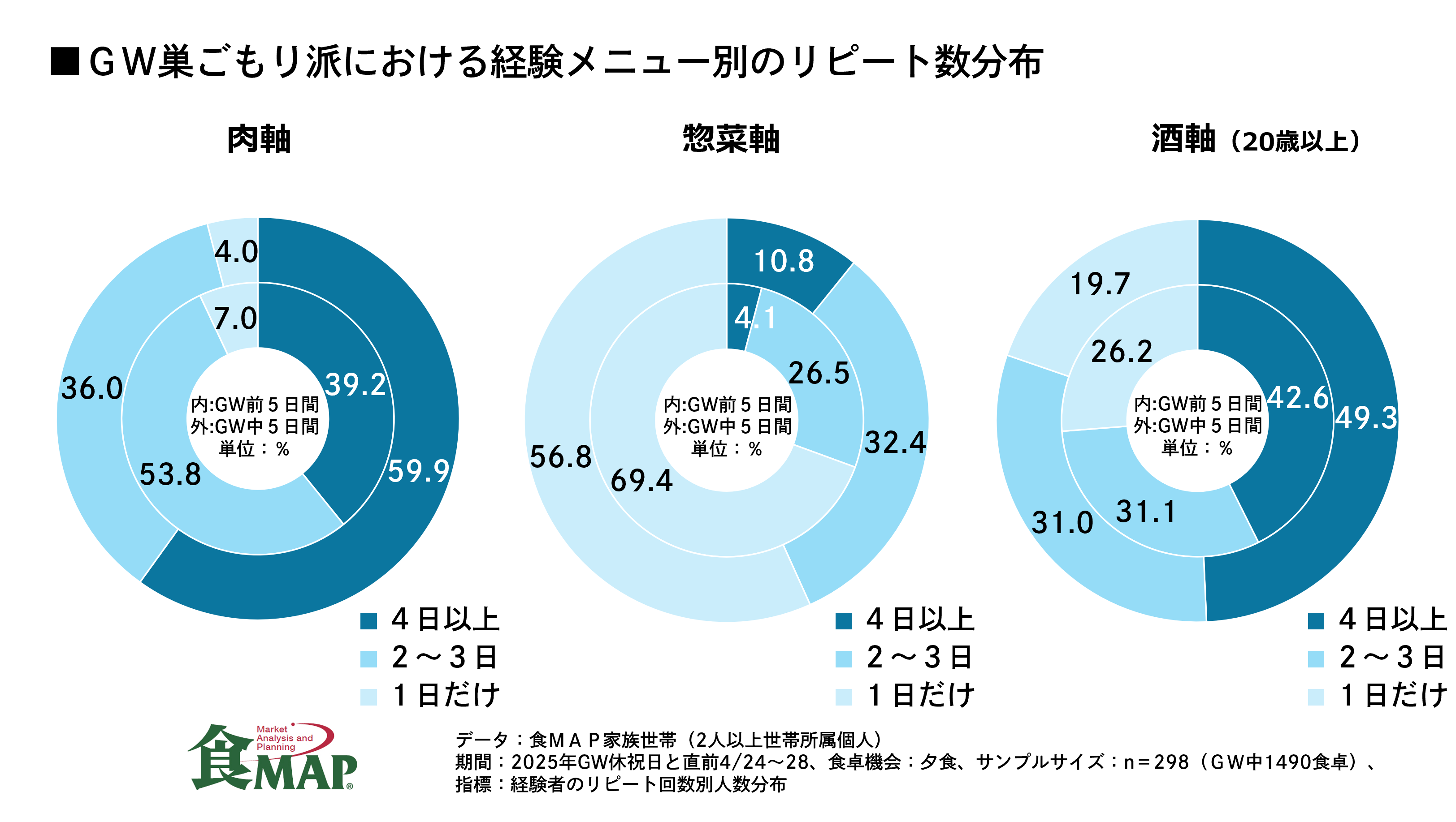 実際、GW中に何度繰り返し食べているのでしょうか?図表5は、GW中5日間とその直前5日間における、夕食でのリピート日数と人数分布を示しています。焼き肉や焼き鳥などの肉メニューの他に、精肉や加工肉を使用したメニューすべてを“肉軸”とすると、GW5日間の内4日以上食べている人の割合は59.9%に達しています。これは直前5日間の39.2%と比べ20ポイントの増加となり、いかに多くの人が毎日のように肉類を楽しんでいるかを示しています。メニューだけではなく、お惣菜の利用状況を示しているのが“惣菜軸”です。お惣菜を利用した人の1割は4日以上利用しており、直前に比べ2倍以上の増加です。しかし1日だけの割合が半数以上となっており、まだまだリピーターの獲得余地が大きいことも分かります。最後にアルコールの利用頻度分布を示すのが“酒軸”です。もともとヘビーユーザーの多い嗜好品ですが、GW中は4日以上の利用が6ポイント増加し、約半数のユーザーが毎晩のようにお酒を楽しんでいることがうかがえます。他にもスパイスを使った手作りメニュー軸や、魚介軸、冷凍食品軸、サラダ軸、食後のスイーツ軸など、多くのカテゴリーで繰り返し利用するヘビー化が起きる様子が確認されました。