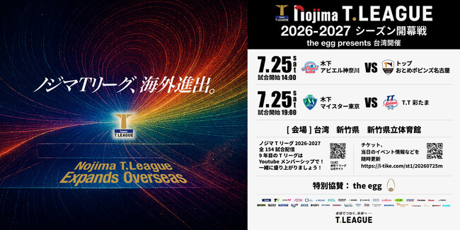 Tリーグでは、台湾・新竹県で行われるノジマTリーグ 2026-2027シーズン 男女開幕戦の特別協賛として、the egg (森欣実業股份有限公司)が決定いたしました。