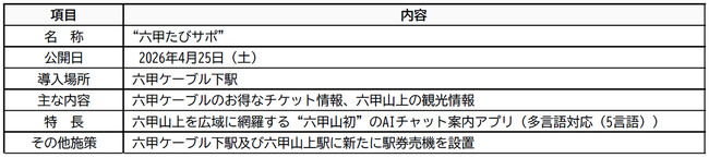 神戸六甲鉄道株式会社(本社:神戸市灘区、社長:川邉直哉)は、六甲ケーブルのお得なチケットの情報やアクセス情報、六甲山の観光施設の情報を案内する、多言語対応(5言語)のAIチャットアプリ「六甲たびサポ」を開発し、2026年4月25日(土)から六甲ケーブル下駅で公開します。