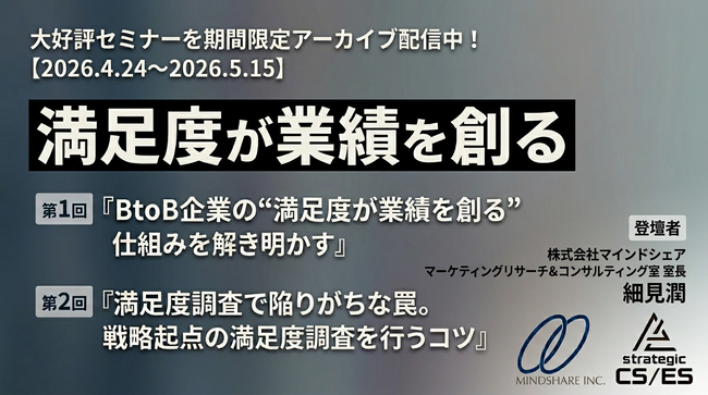 株式会社マインドシェア(本社:東京都港区、代表取締役:今井祥雅)は、2025年度に開催し、大好評をいただいた自社オンラインセミナー『満足度が業績を創る』(全2回)を4月24日(金)~5月15日(金)の期間限定で無料配信いたします。