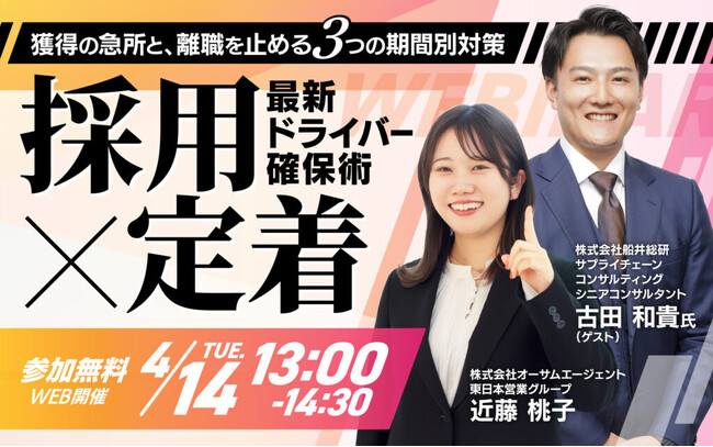 株式会社船井総研サプライチェーンコンサルティング(本社:東京都中央区、代表取締役社長:橋本直行、以下「船井総研SC」)は、2026年4月14日(火)、株式会社オーサムエージェント様主催のオンラインセミナーにて、運送・物流企業を対象に「【採用×定着】最新ドライバー確保術 ~獲得の急所と、離職を止める3つの期間別対策~」と題した講演を実施いたしました。