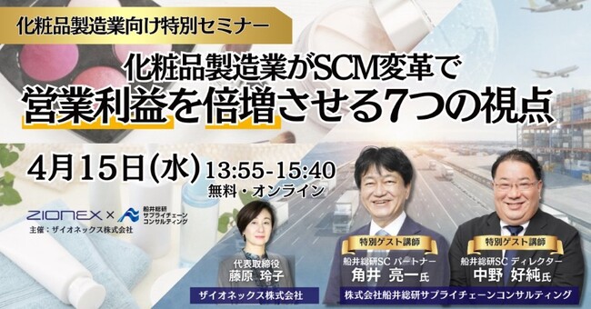 2026年4月15日(水)、株式会社船井総研サプライチェーンコンサルティング(本社:東京都中央区、代表:橋本直行、以下「船井総研SC」)のコンサルタントが、ザイオネックス株式会社様が主催する「化粧品製造業がSCM変革で営業利益を倍増させる具体的手法セミナー」に登壇しました。
