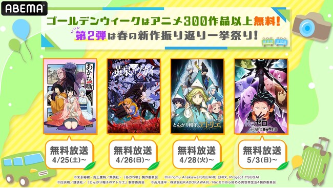 新しい未来のテレビ「ABEMA」は、ゴールデンウィーク特別企画「アニメ300作品以上無料大放出祭」の一環として、2026年4月25日(土)より、新作春アニメ40作品超の無料振り返り一挙放送を実施いたします。