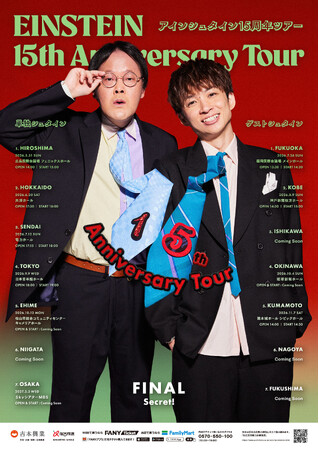 本ツアーは、2人のネタと独自の空気感を凝縮した「単独シュタイン」と、豪華ゲストを迎えたネタ&コーナー企画「ゲストシュタイン」の2本立てで展開。15年の歩みを詰め込んだ、アインシュタインならではのステージを各地でお届けします。